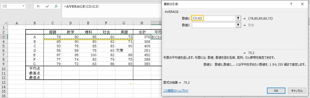 平均値を求めたい範囲を選択しなおして、[OK]ボタンをクリックします。平均値が表示されます。