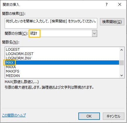 をクリックします。「関数の挿入」画面で、「統計」の「MAX」を選択します。
