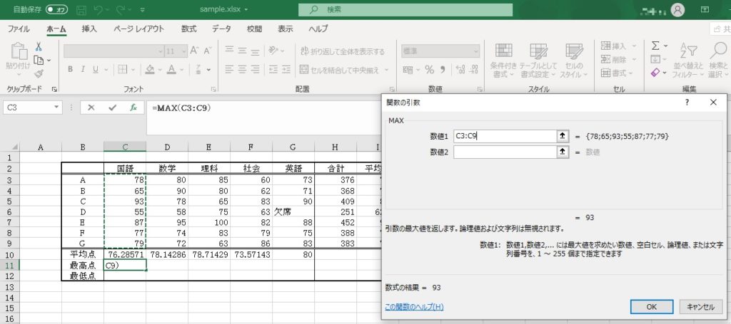 最大値を求めたい範囲を選択しなおして、[OK]ボタンをクリックします。最大値が表示されます。