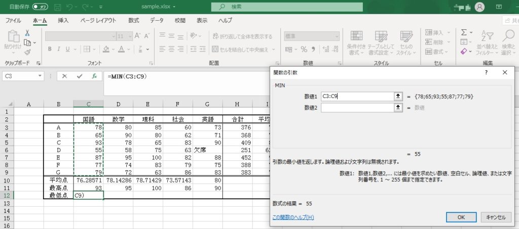 最小値を求めたい範囲を選択しなおして、[OK]ボタンをクリックします。最小値が表示されます。