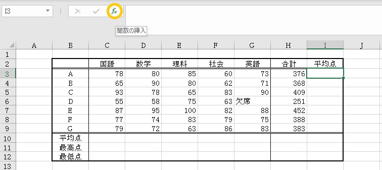 平均値を入力したいセルをクリックして、「関数の挿入」ボタンをクリックします。