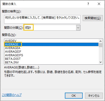 「関数の挿入」画面で、「統計」の「AVERAGE」を選択します。