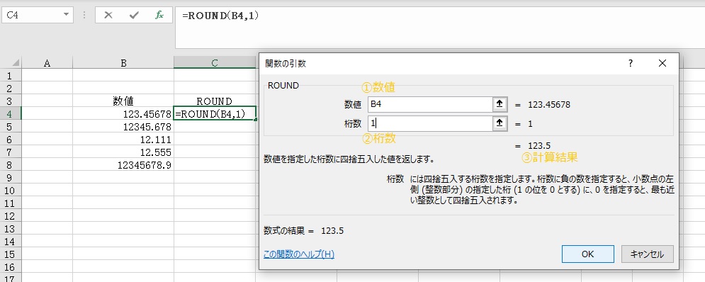 2・・・桁数を入力します。ここでは、小数点以下の桁数を入力するので、「1」と入力すれば小数第二位が四捨五入され、小数点以下1ケタが出力されます。「0」を入力すると、小数点以下が四捨五入され整数で出力されます。また桁数をマイナスにすると、整数の部分まで四捨五入することもできます。