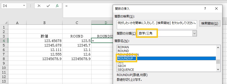 ROUNDDONW関数も「数学/三角」に分類されています。ROUND関数とROUNDUP関数と同じように引数を入力します。