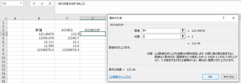 ROUNDUP関数は指定した桁に切り上げを行う関数です。