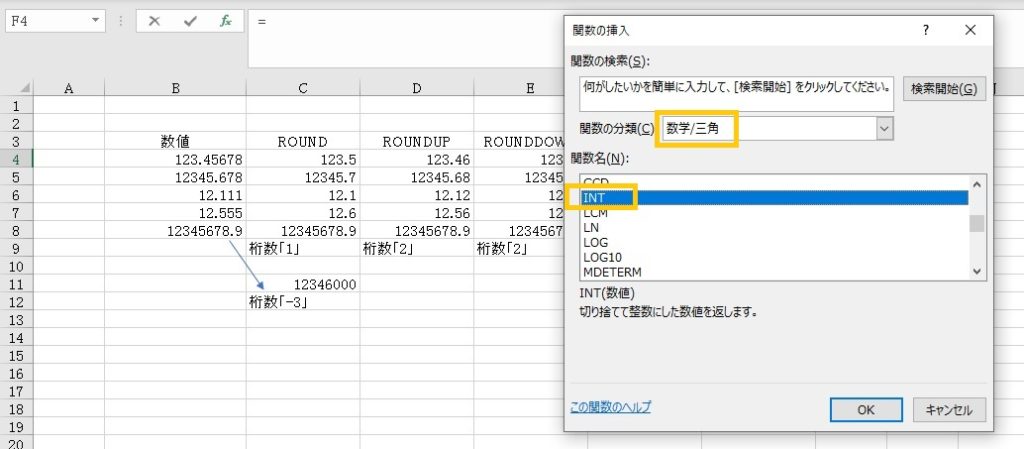 INT関数は小数点以下を切り捨てて整数を出力します。ROUNDDOWN関数で桁数を「0」にした場合と同じ結果が得られます。