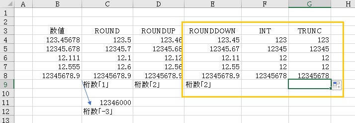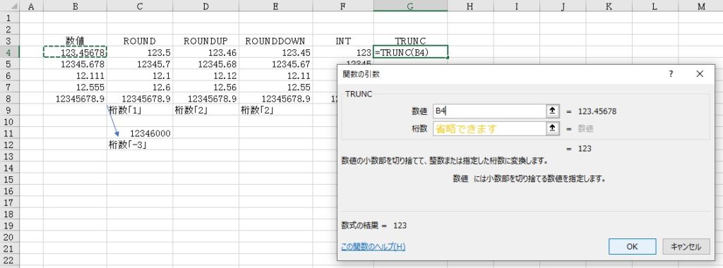 TRUNC関数とROUNDDOWN関数の違いは、引数を入力する際にTRUNC関数の桁数が省略できるという部分です。