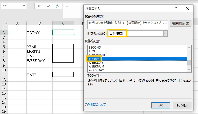 TODAY関数は現在の日付を表示する関数です。「日付/時刻」に分類されています。関数を選択して「OK」ボタンをクリックします。