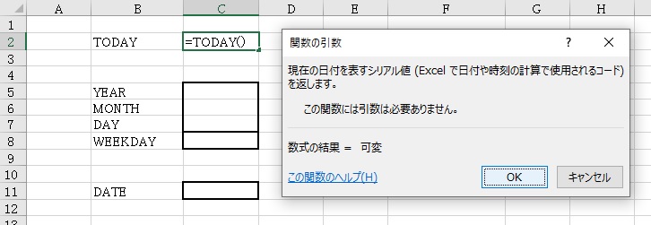 TODAY関数には引数はありません。そのまま「OK」ボタンをクリックします。(「シリアル値」に関しては、この記事の最後を参照してください。)
