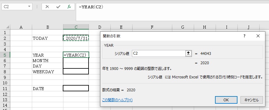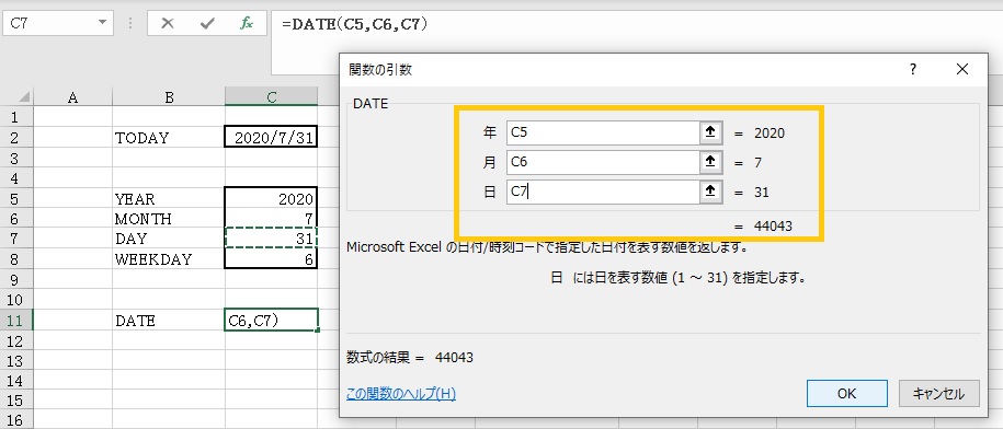 今回は、年に「2020」、月に「7」、日に「31」を入力します。(結果のシリアル値は、画面から「44043」であることがわかります。)
