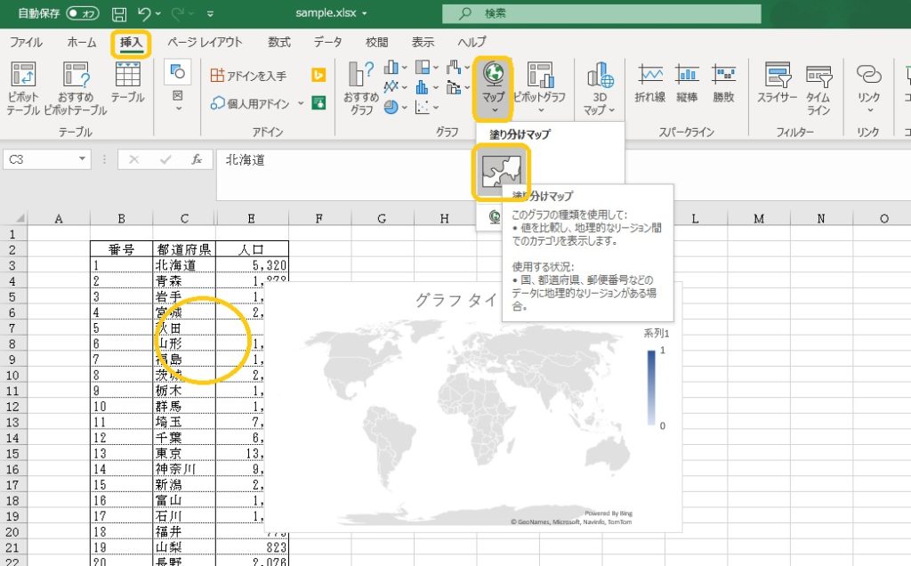 マップグラフを利用したい表を選択します。セルを選択すると、自動で範囲選択されます。「挿入」―「グラフ」の「マップ」ボタンをクリックします。「塗り分けマップ」をクリックすると、塗り分けマップが表示されます。