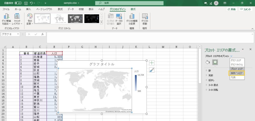 マップのプロットエリアの部分をクリックすると、右に「プロットエリアの書式設定」画面が出てきます。プロットエリアのオプションから「系列"〇〇"」を選択します。