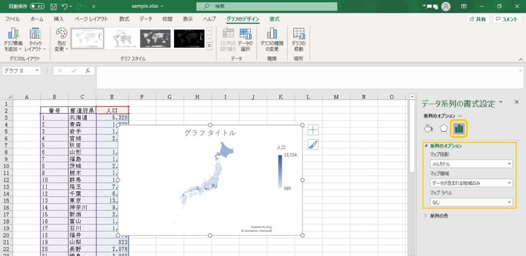 「データ系列の書式設定」に変わるので、「系列のオプション」からマップの種類やマップの領域を設定します。今回は日本国内(県別)のデータを使用しているので、日本地図が表示されるように設定しました。