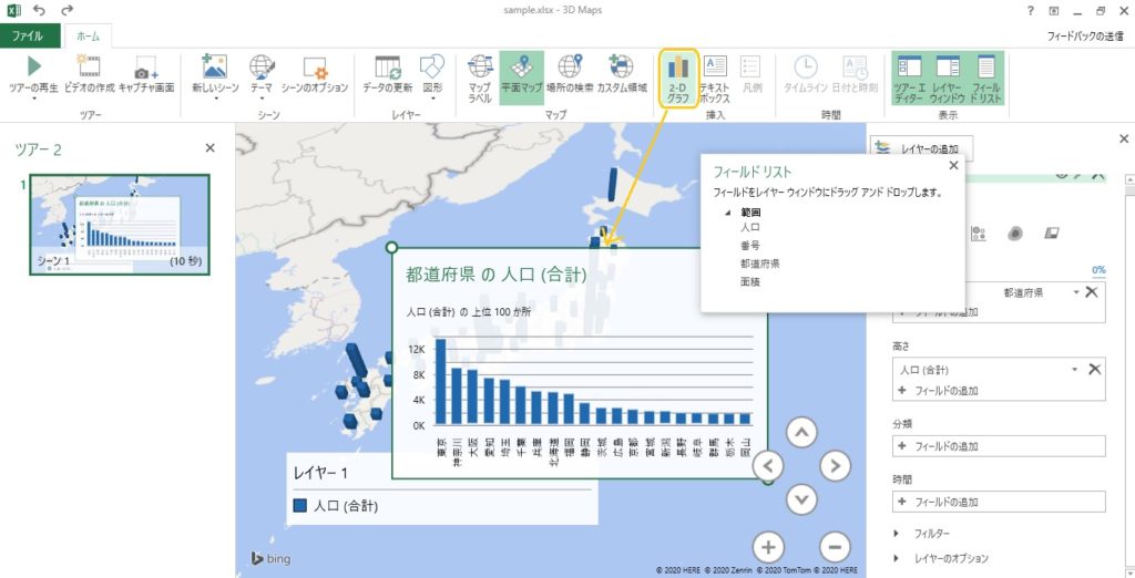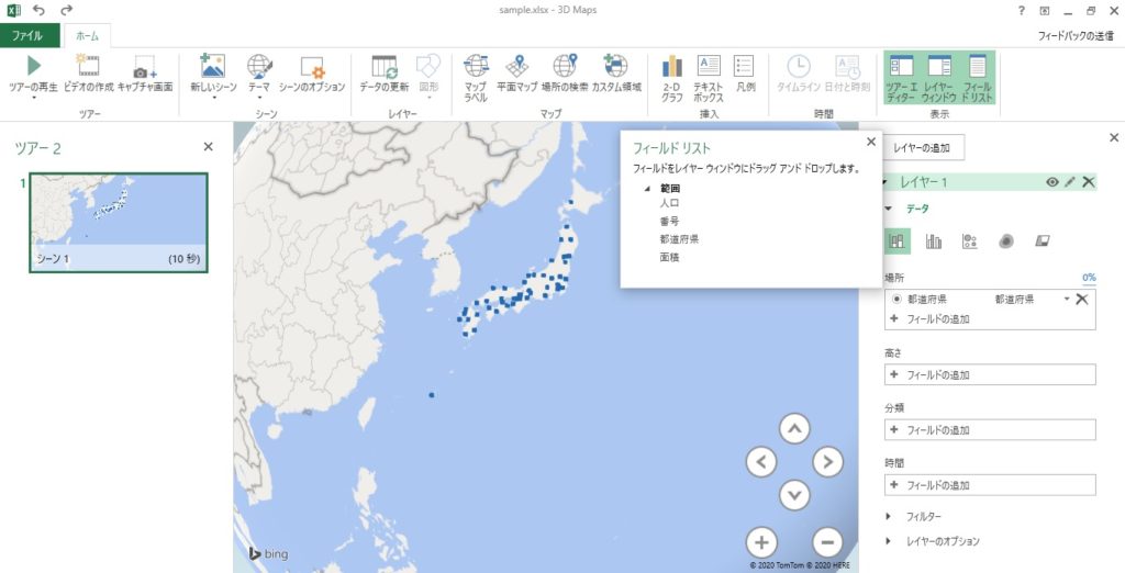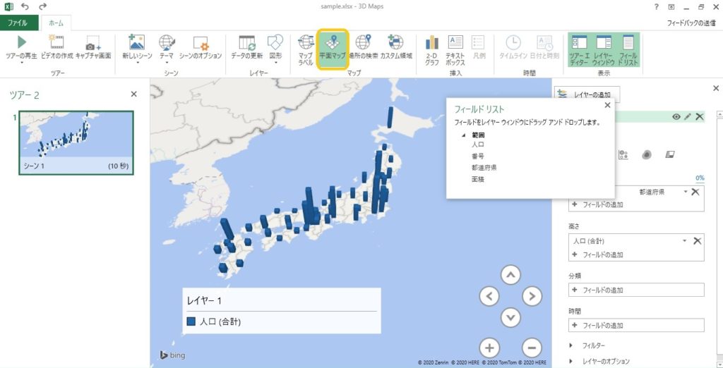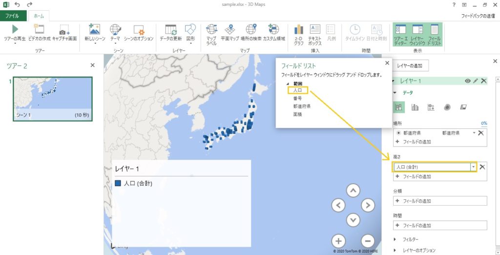 今回は人口のデータをマップ上に表示したいので、フィールドリストから「人口」を、右の「高さ」までドラッグします。