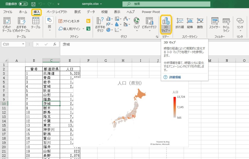 前回のマップグラフに引き続き、マップを使ったデータの表し方「3Dマップ」について、簡単に説明します。