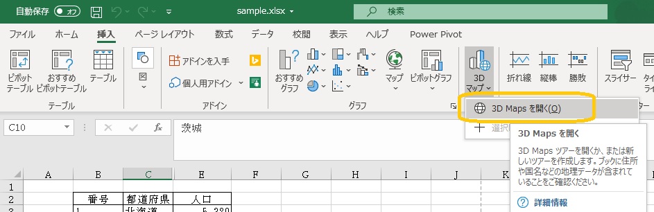 3Dマップで使いたいデータのセルを選択します。「挿入」―「ツアー」の「3Dマップ」ボタンをクリックします。「3D Mapsを開く」ボタンをクリックします。