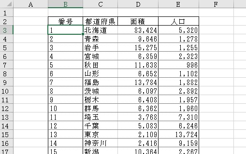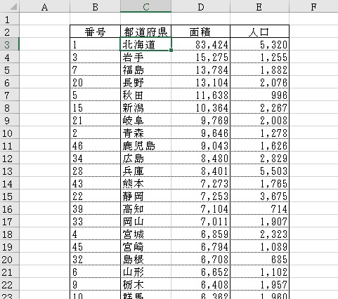 「並べ替え」の入力できたら[OK]ボタンをクリックします。次のように並べ替えられます。(今回は、それぞれのキーで全く同じ値が存在しないので、「面積」の列での並べ替えで済んでいます。)
