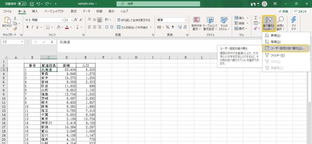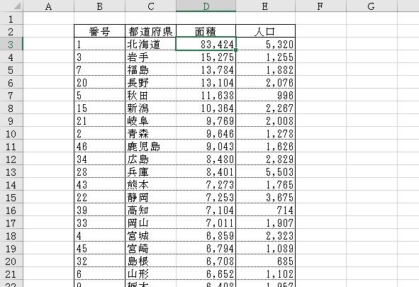 例えば、今回のデータで「面積」の列の一つをクリックしておき、「並べ替えとフィルター」ボタンをクリックしてから「降順」を選択すると、次のようになります。「面積」の列を中心に数値の大きい順に並べ替えられます。