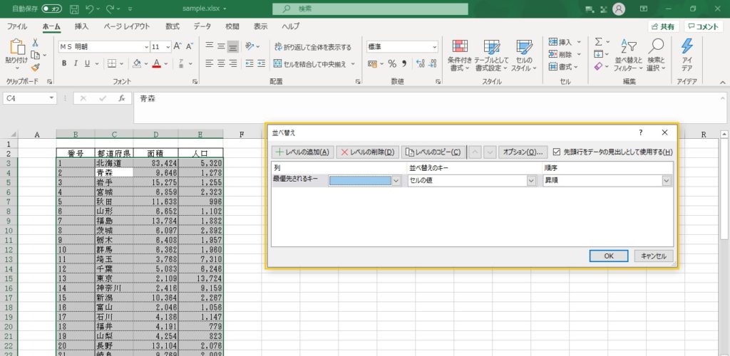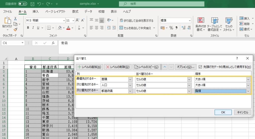 複数の列があるデータの場合、複数のデータで並べ替えを行いたいとき、次のように操作します。