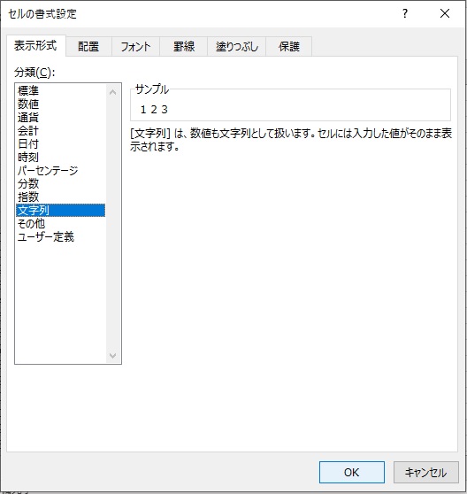 「セルの表示形式」で、「表示形式」タブをクリックし、分類から「文字列」を選択して「OK」をクリックします。