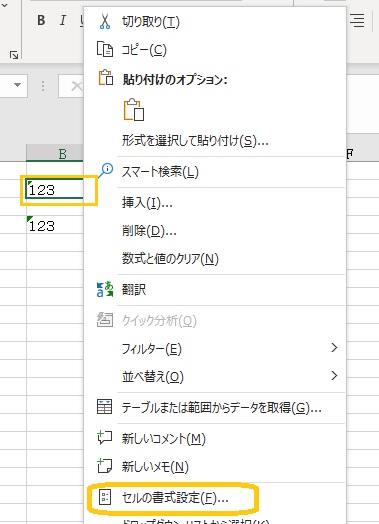 文字を入力したいセルを右クリックすると、ショートカットメニューが表示されます。そこで、「セルの表示形式」をクリックします。