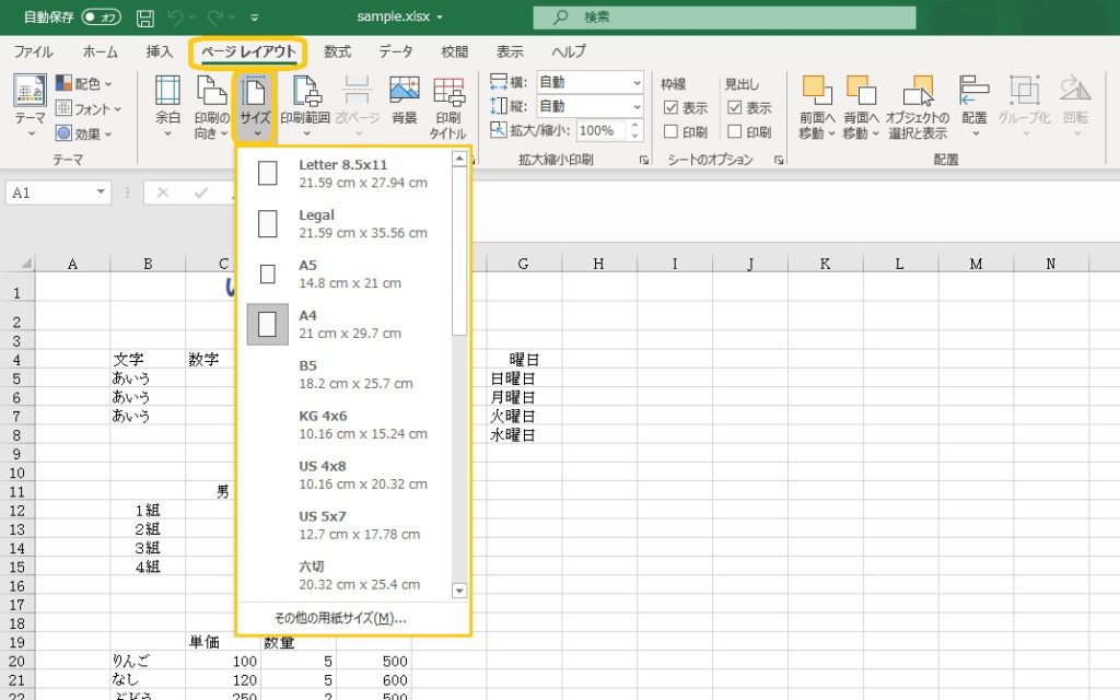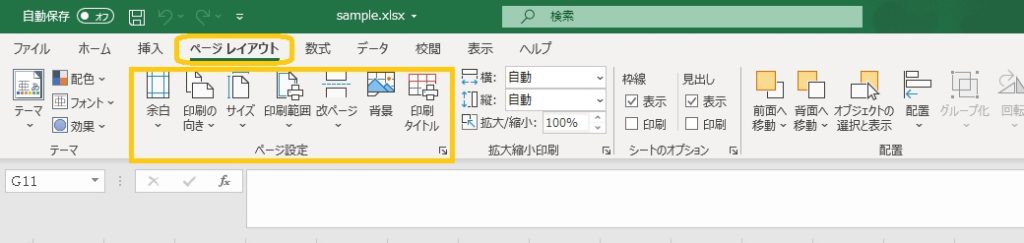 「ページレイアウト」タブの「ページ設定」リボンにボタンがあります。それぞれのボタンをクリックすると、詳細が下に出てきます。