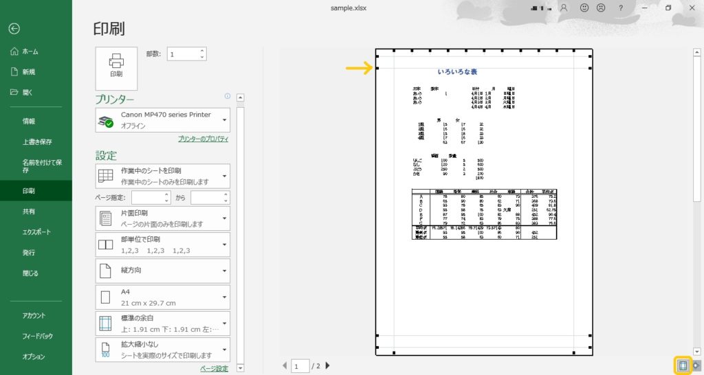 また、印刷画面からの設定では、右下の「余白の表示」ボタンをクリックすると、印刷プレビューで余白の線が表示できます。ポインタを線に合わせてドラッグすることで、余白を変更できます。