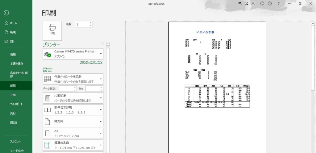 「ファイル」タブをクリックすると、下の図のような画面が出てきます。左の「印刷」タブをクリックして印刷画面を出します。そして、設定の部分で印刷設定を変更することができます。