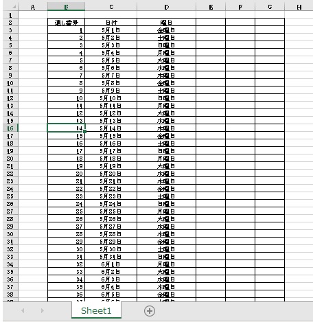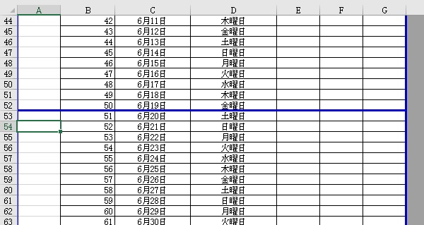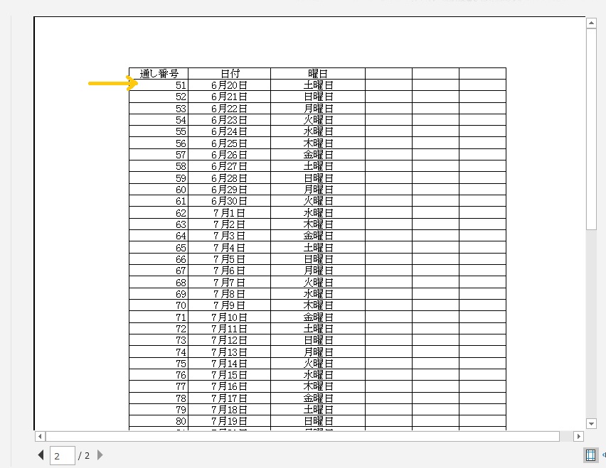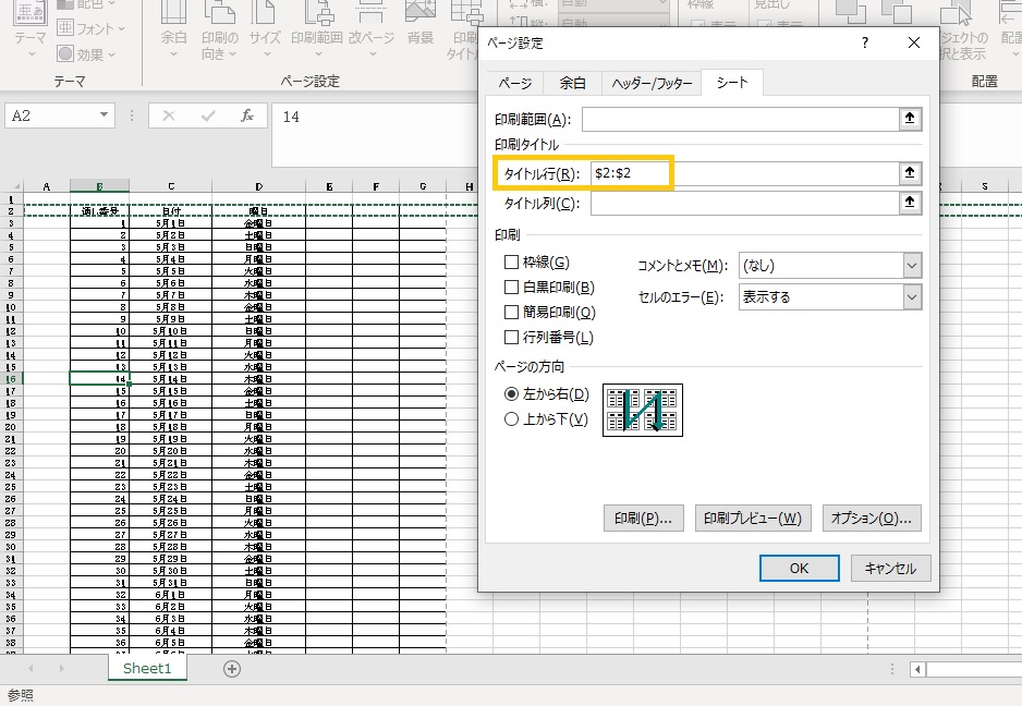 2ページ目の1行目が項目の行になります。印刷タイトルの設定をしておくと、行が挿入されても常に項目がページの一番上に表示されることになるので便利です。