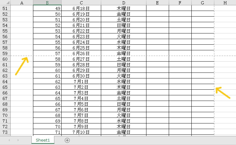 改ページはページの区切りを変更する設定です。通常、何も設定せずに印刷をすると、適当な位置で改ページされ、シートには下のように点線でページの区切りが表示されます。