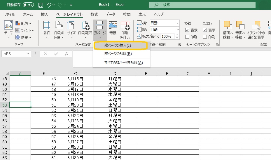 ページの区切りを変えたい場合は、区切りたい場所のセルをクリックし、「ページレイアウト」―「改ページ」の「改ページの挿入」を選択します。