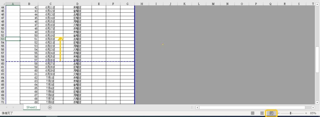 また、改ページの方法として、「改ページプレビュー」を利用する方法もあります。Excel画面の右下にある「改ページプレビュー」ボタンをクリックすると、印刷範囲と改ページの表示ができます。この状態で、改ページの線をドラッグします。