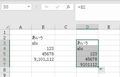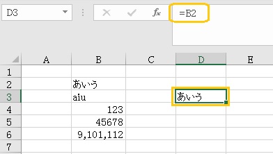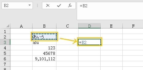 数式バーを見ると、「=B2」が入力されていますが、セルには「あいう」と表示されています。