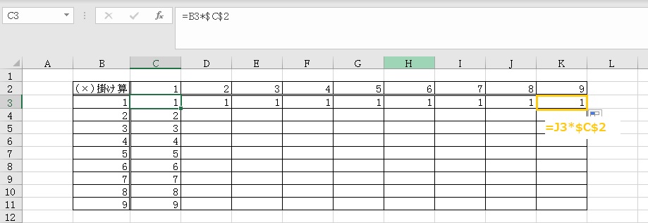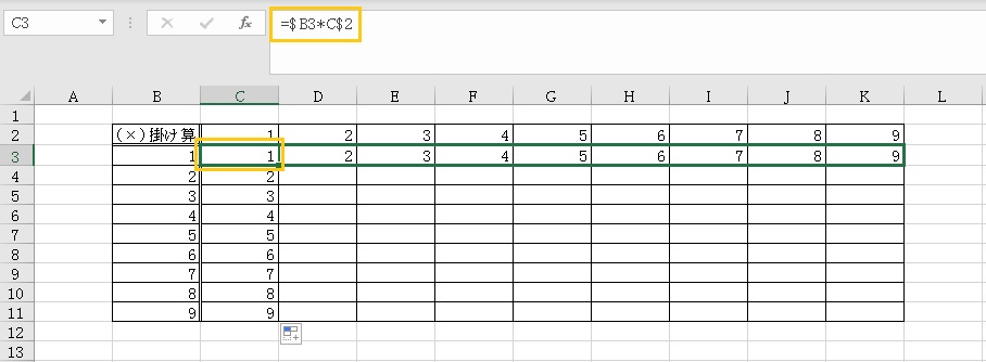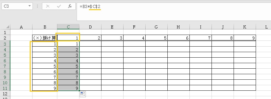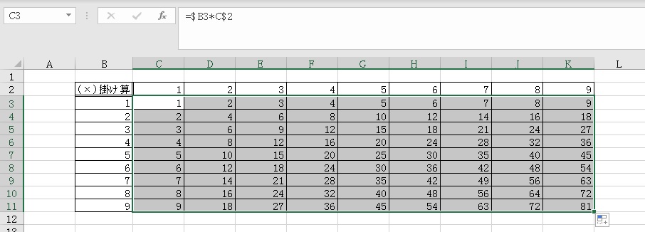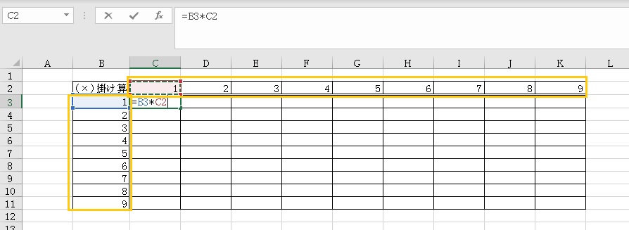 下の図は、掛け算の九九の表です。B列の数値と2行目の数値をかけて表を作成します。いったん、「C3」のセルに「=B3*C2」と入力しています。