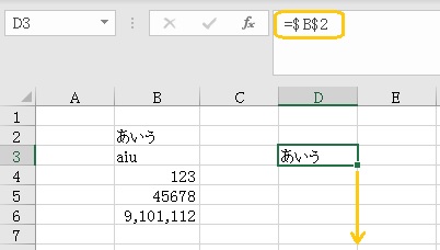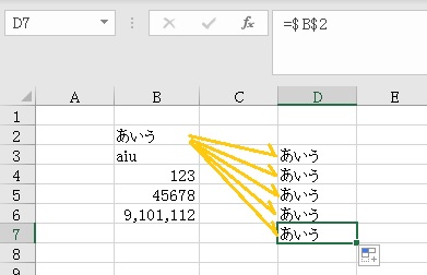 この場合、参照元のセルはB2で変わりません。参照するセルが固定されていて変わらないことを絶対参照と言います。