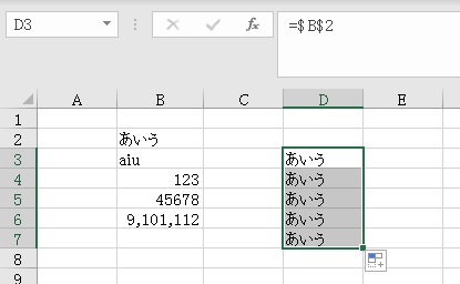 「D3」に「=$B$2」と入力された状態で、下方向にオートフィルでコピーします。