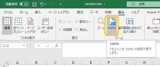 素早く元の大きさに戻したいときは、「表示」―「ズーム」の「100%」ボタンをクリックします。