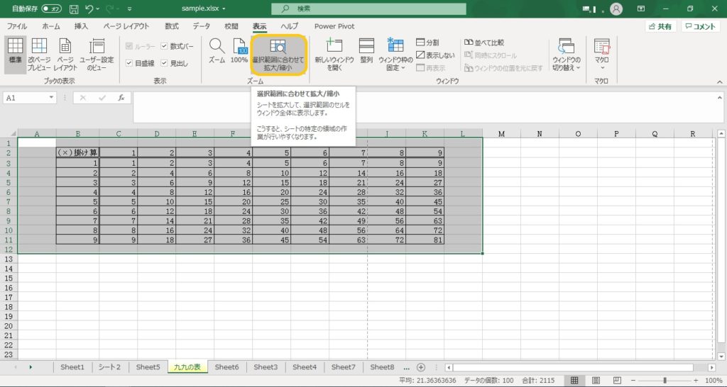 ズームをしたい範囲が決まっている場合は、範囲を選択してから「表示」―「ズーム」の「選択範囲に合わせて拡大/縮小」をクリックします。