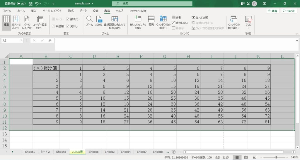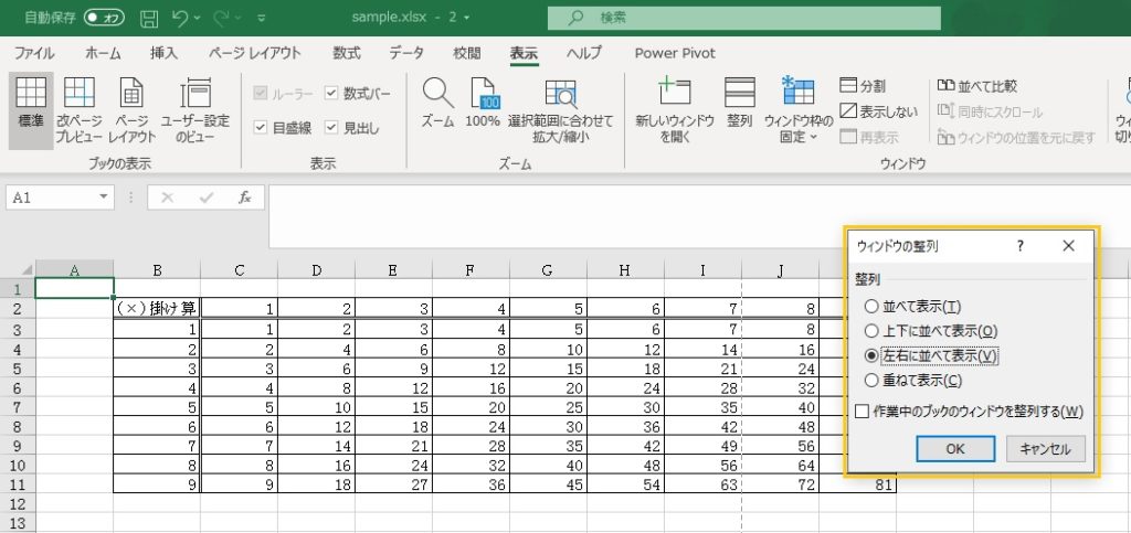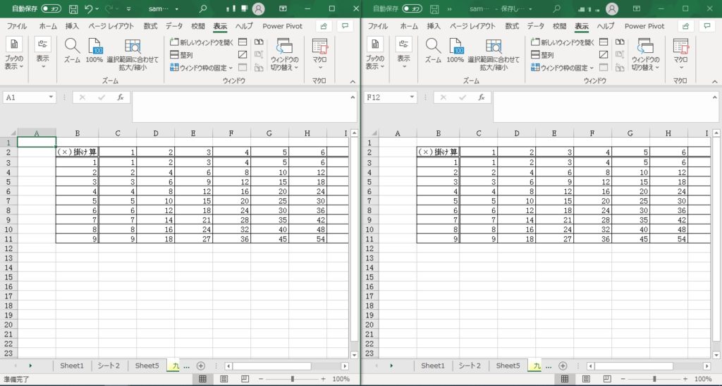 左右に並べて表示されました。(今回は同じブックを二つ開いて並べていますが、異なる複数のブックでも並べることができます。)