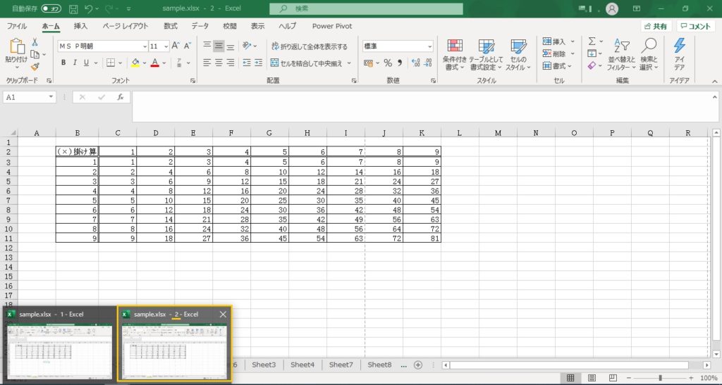 同じブックが二つ開いたことがわかります。このブックは同じブックのため、片方を変更すると、もう片方にも適用されます。
