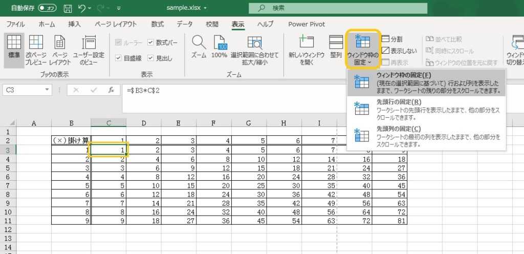 「表示」―「ウィンドウ」―「ウィンドウ枠の固定」ボタンをクリックします。「ウィンドウ枠の固定」を選択する場合は、あらかじめセルで範囲を指定しておく必要があります。