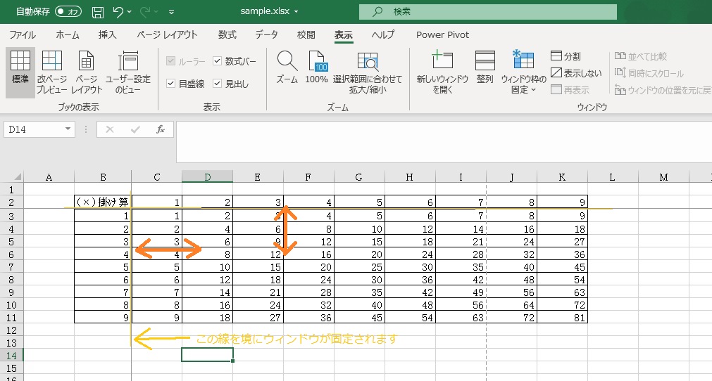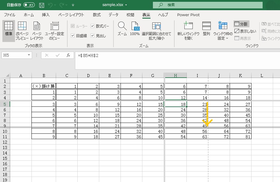 同じシート内で、離れた範囲を同時に見たい場合は「分割」を使うこともできます。「分割」は画面を4つに分けて見ることができます。