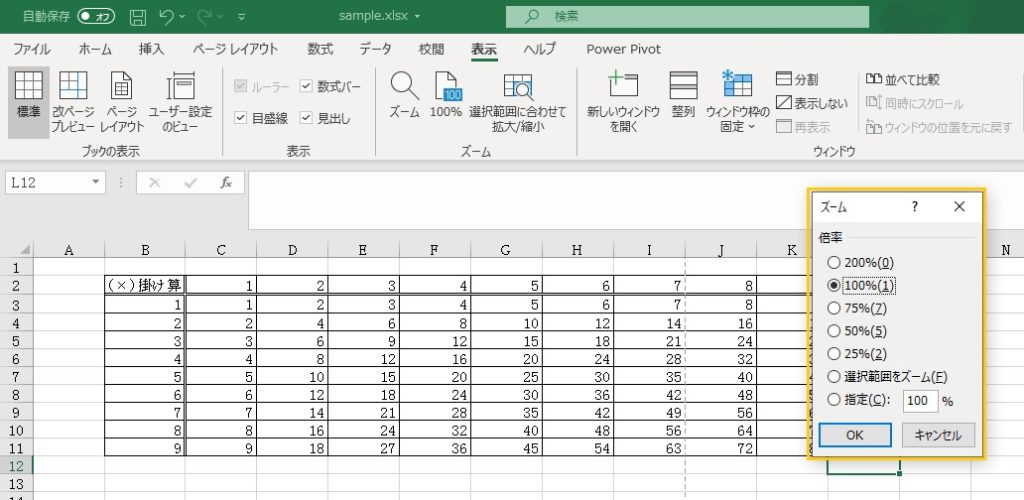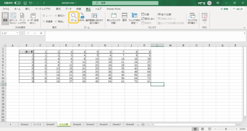 シートをズームで見たり、反対に小さく見たい場合は、ズームの機能を使います。「表示」―「ズーム」の「ズーム」ボタンをクリックします。