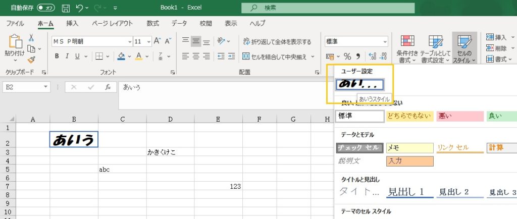 最初からExcelに入っているスタイルを使う場合は、スタイルを適用したいセルをクリックしてから、「ホーム」―「スタイル」から「セルのスタイル」をクリックします。下にサンプルが現れるので、適用したいスタイルをクリックします。