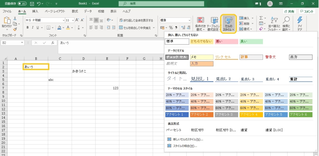 書式を適用したいセルを選んで、「セルのスタイル」ボタンからスタイル名をクリックします。これで、セルにスタイルが適用できます。