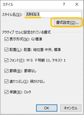 「スタイル」の画面でスタイルを作成します。スタイル名を入力して、「書式設定」ボタンをクリックします。