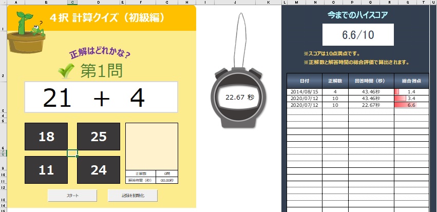 | データ、使い方 | Excelファイルが1つです。使い方を説明したシートと計算クイズのシートの計2シートです。 初級はたし算(2ケタ+1ケタ)と引き算(2ケタ-1ケタ)のみです。 上級はかけ算(2ケタ×1ケタ)と割り算(2ケタ÷1ケタ)のみです |