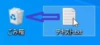 上図のように、テキスト.txtをクリックで押さえたままごみ箱まで移動させると、テキスト.txtがごみ箱に入ります。