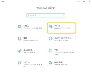 [スタート]ボタンから、[設定]ボタンをクリックし、Windowsの設定からデバイスを選択します。そのあと、マウスの項目を選択すれば、マウスに関する設定を変更することができます。