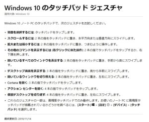 なお、MicrosoftのWindowsサポートのページにタッチパッドジェスチャに関する情報が記載されています。